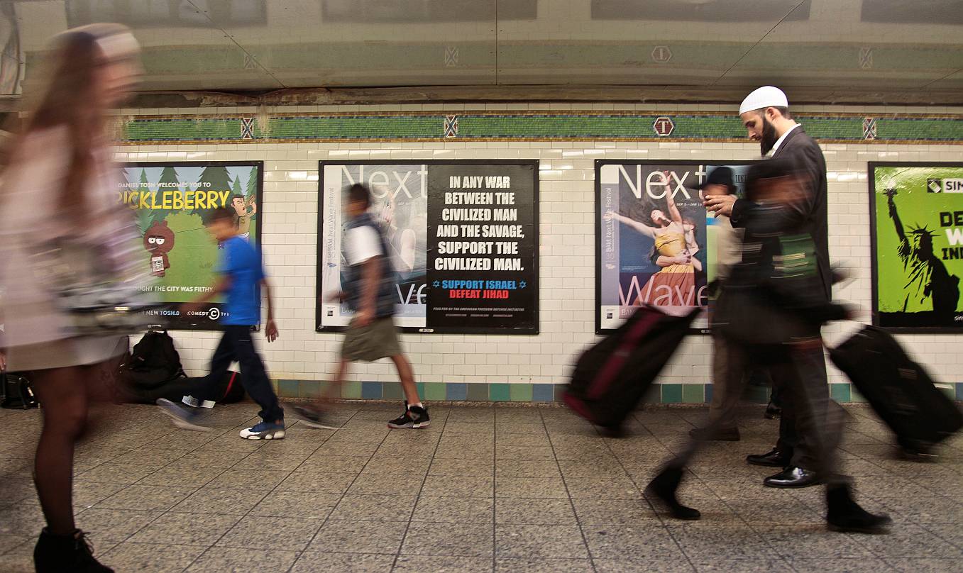 Photograph of Cyrus McGoldrick, advocacy director for the Council on American-Islamic Relations, standing near one of Pamela Geller’s racist ads on Monday, Sept. 24, 2012, in New York’s Times Square subway station, by Bebeto Matthews (AP Photo). http://www.vosizneias.com/114450/2012/10/05/new-york-pro-muslim-ads-going-up-by-nyc-subway-savage-ads or http://bit.ly/Vv9kqQ